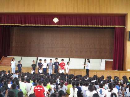 1時間目に,夏休み後集会を行いました。まず,校長先生からお話があり。その後,夏休み中に行われた各部活動の大会での表彰を行いました。