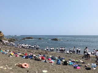 午後一番は宮崎浜での活動です。お天気はとても良いのですが, 潮の状況が良くないこと,遠くの台風の影響で風と波があることで磯観察は中止にしました。波打ち際で波と戯れながらお気に入りの石を探しています。