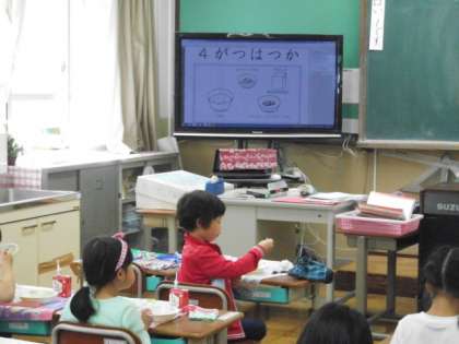 今週から,給食カレンダーを教室の大型テレビや電子黒板にうつせるようにしています。1年生の教室では,献立の部分だけを大きくうつして,みんながみえるようにしていました。置き方等もよくわかりますね。