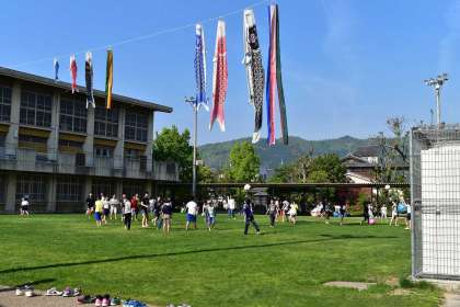 裸足になって,気持ちよさそうにのびのびと遊んでいます。中庭いっぱいに芝生の香りが広がっていました。こいのぼりが青い空に泳いでいます。