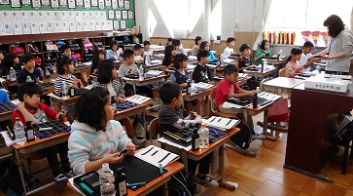初めての「書写」で,毛筆で字を書く学習をしました。子どもたちは,道具の準備の仕方,基本的な筆の使い方,後片付けの仕方など,初めてのことをたくさん学んで帰っていると思います。おうちでも聞いていただければと思います。