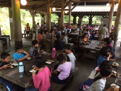 野外でお昼ごはんです!ハンバーグ弁当をみんなで楽しく食べてます!天気もなんとかもっています!