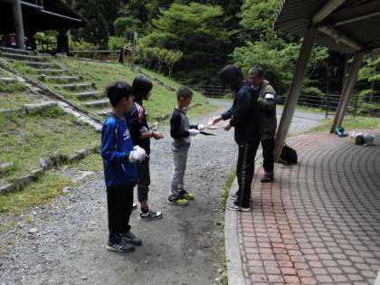 魚をさばいた後は,塩を振ってもらい,炭で焼きます。