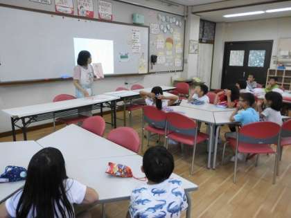 栄養教諭の先生から,ランチルームでどんなことをするのか,教えてもらいました。