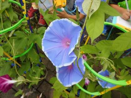 1年生が育てているアサガオの花が,咲いています。