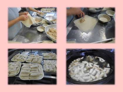 ★給食室で春巻を作っていると窓から「今日,春巻や!!」という声が聞こえてきました。春巻は,給食室で一つ一つ心をこめて巻いて作ります。具には,まぐろフレーク,たけのこ,しいたけ,はるさめを使っています。