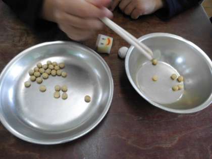 スポンジや大豆をつまむ練習も最後にしました。