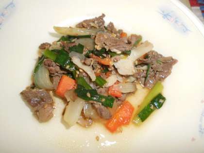 ★プルコギは,牛肉に【にんにく・さとう・料理酒・こしょう・こいくちしょうゆ・ごま油】で下味をつけて炒めます。そこに【たまねぎ・にんじん・まいたけ・にら・いりごま】と入れ,さらに炒め,調味して仕上げています。