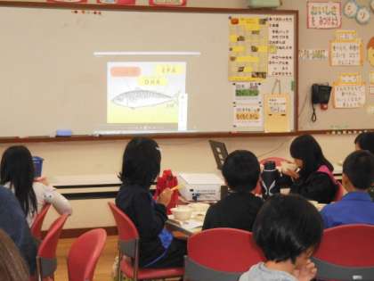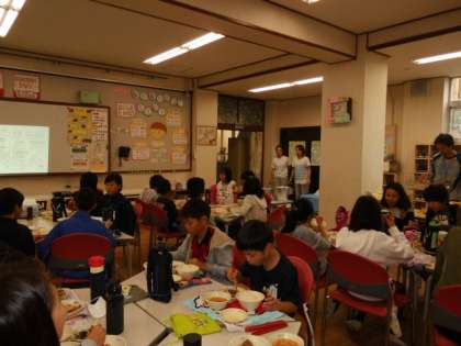 ★今日のランチルームは,5−1でした。和(なごみ)献立のことを伝える動画を見ながら,給食を食べました。今日は,ランチルームに給食調理員さんが子どもたちの様子を見に来られました。