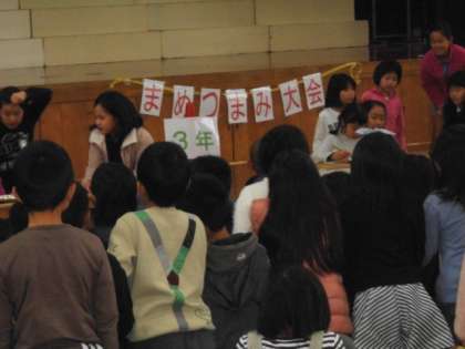 中間休み,体育館で3・4年生の豆つまみ大会を行いました。