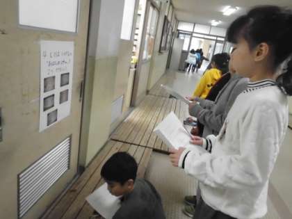 中間休み,体育館下廊下でクイズラリーをしています。