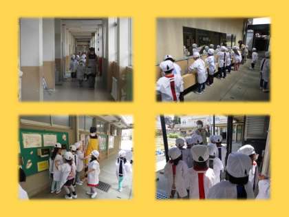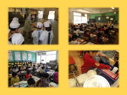 ★1年生は,初めての給食でした。当番さんは,何もかもはじめてですね。手洗いの仕方等から,少しずつ覚えていってくださいね。お家でも感想をきいてあげてください。