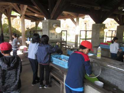 野外炊事の様子です。グループで役割分担をして準備をしました。
