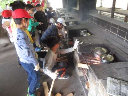 かまどを作って、火をつけました。はじめはなかなか火が付かなくて苦労しました。熱さに負けず、頑張っていました。