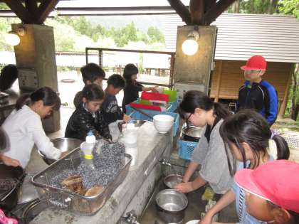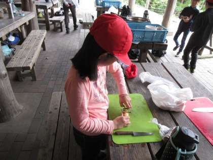 野外炊事の様子です。昨日一度経験しているだけあって、手際が良く、準備がスムーズにできていました。本日はカレーライスです。おいしいカレーができるように、一生懸命作っていました。