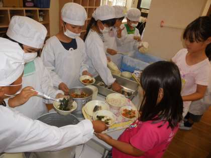 みんなで協力して配膳をして,