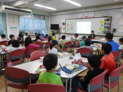 ★今日のランチルームは,3−2でした。給食前に「のどがかわいたときののみものについて考えよう」をテーマに学習しました。