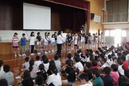 その後は,夏休み中に行われた全市卓球交流会・バドミントン交流会の表彰,運動会の色決め集会がありました。