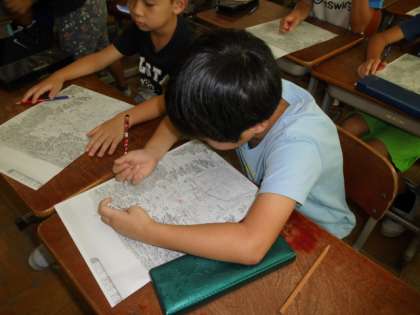 京都の地図をみながら,京野菜についている地名を探したり,「弘法さんと九条ねぎ」という紙芝居や九条ねぎについてのクイズ等も行い,最後にワークシートを使い,京野菜の名前の確認をしました。