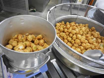 ★給食のがんもどきは,水気をきった豆腐に鶏ひき肉・おから・にんじん・しいたけ・えだ豆をまぜ合わせて丸め,油で揚げました。給食室で一つ一つ心をこめて作りました。だしのきいた「あん」をかけて食べます。手作りのおいしさを味わいました。