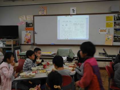 ★ランチルームでの給食を始めました。3学期のランチルームでは,「コツコツ骨をためよう」というテーマで学習します。今日は,3−1でした。
