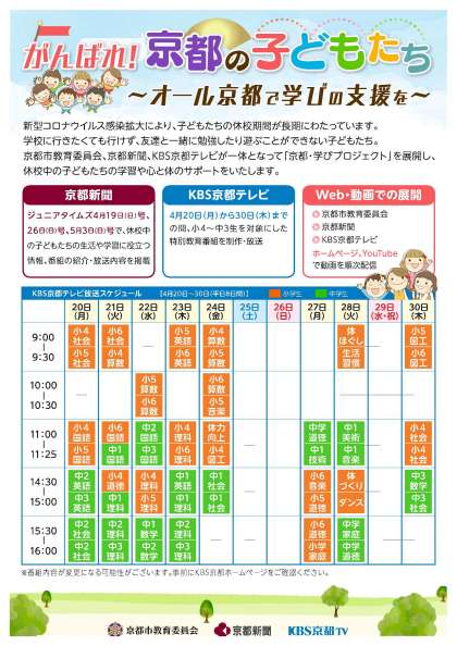 各学年各教科等で主に4月に学習予定であった単元の内容を短縮して紹介したり,家庭学習の進め方等を提案したりするコンテンツ画像が,KBS京都テレビで放送するとともに,動画投稿サイトで配信される予定です。