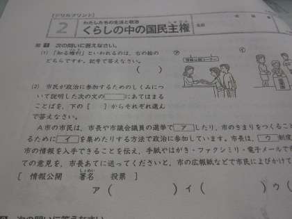 5月7日(木)の社会の課題として「くらしの中の基本的人権の尊重」「くらしの中の国民主権」というプリントが出ています。教科書の10ページ〜17ページを見て取り組んでください。1日で裏表を仕上げてくださいね。
