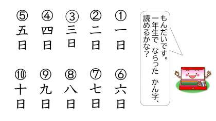 1年生で ならった かん字の 中から,日づけの 読み方の もんだいです!わかるかな?