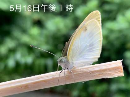 モンシロチョウをわりばしの先にのせて,雨の当たらないところにおいておくと,空にむかって,飛び立っていきました。