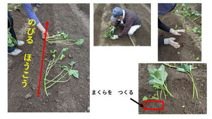 さいしょに うねに くぼみを つくり,そこに なえを ならべていきます。そのときに 気を つける ことは,ならべる ほうこうを そろえる ことです。
