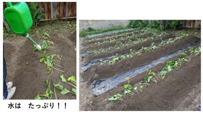 つぎは なえに 土を かぶせて いきます。のびるところが 土に うもれて しまわないよう,まくらを つくるように かぶせます。