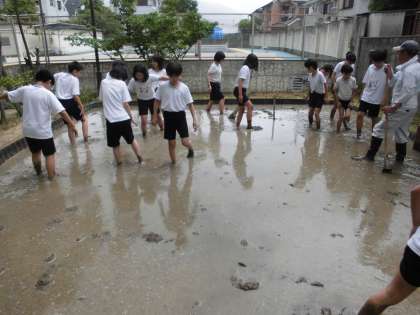 9日(火),10日(水)の2日間,A・Bそれぞれの子どもたちで,「代かき」を体験しました。田植えの前に行う作業のことで,水を張った田んぼの土を砕いていきます。