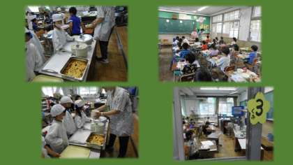 ★チーズの焼き目ができるだけ,みんなの食器に入るように配りました。1年生の教室でおかわりを配っていると,「おかわりはしたいけど,ズッキーニのところはくばらないでください」という子がいました。野菜の名まえをよく知っていました!!