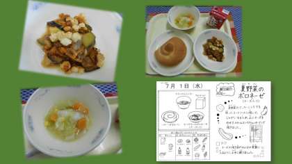 ★夏野菜のボロネーゼ(チーズ入り)は,ズッキーニ(長野県産)となす(京都府産)を使ったミートソースに,焼いたじゃがいもを入れ,上にチーズをのせてスチームコンベクションオーブンで焼きました。今日は,中間休みくらいからミートソースのような,オレガノ等のイタリアンな香りがしていました。網戸ごしに見ていた6年生が「ピザかと思った」と言っていました。