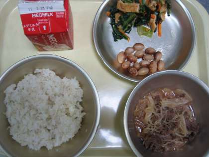 給食には大豆の他にも、色々な「豆」が登場します。今日は”皮の模様が虎の模様に似ている”「とら豆」を甘く煮ました。とら豆はいんげん豆の仲間です(金時豆もその仲間です)食物せんいを多く含み、おなかのそうじをしてくれます。味の濃いおかずのはしやすめにぴったりのおかずでした。