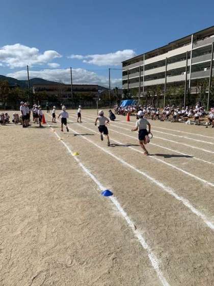 晴天の下、2年3年が力を合わせて走ります。力一杯、最後までバトンをつなぎましょう!
