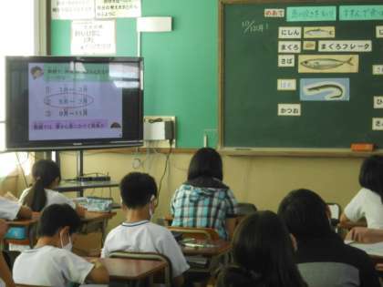 2校時,5−1で「魚の大切さを知り,進んで食べよう」をテーマに,栄養教諭も入り,学習しました。