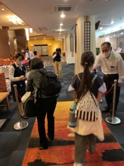 宿に到着しました。消毒でお迎えをしてもらいました。この後、晩御飯です。