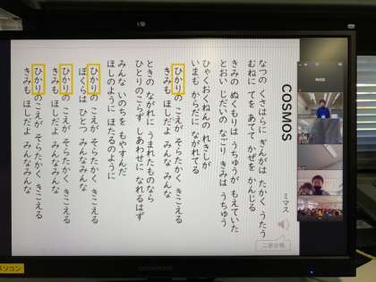 今日のさがのタイムでは,児童会からの人権月間の発表,委員会からのお知らせ,校長先生からの学校誕生のお話とレッツラララでCOSOMSの歌練習をリモートで行いました。