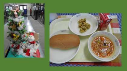 ★12月に入り,子どもたちが給食をとりにくるサービスホールは,少しクリスマスらしい飾りつけにしています。