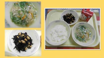 ★「水菜とつみれのはりはり鍋」は,まぐろ水煮・鶏ひき肉・細ねぎ・しょうがと調味料を混ぜ合わせ,給食室で一つ一つ,つみれだんごを作ります。はりはり鍋の「はりはり」とは,水菜のシャキシャキした食感からついたと言われています。かむと口の中でふわっとくずれる手作りのつみれだんごのやわらかな食感と,水菜のシャキシャキとした歯ごたえが味わえる献立です。