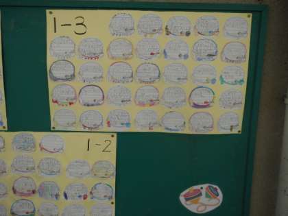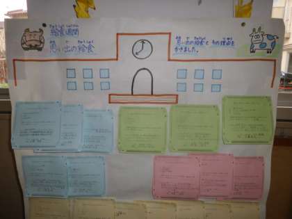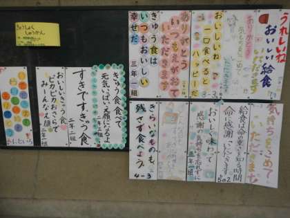 先月の給食週間の取組で各クラスで書いた標語や教職員の思い出の給食を職員室前や給食室横の手洗いの前に掲示しています。