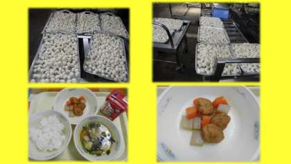 ★ふわふわだんごは,豆腐と白玉粉をこねて生地を作り,一つずつ丸めた手作りのだんごです。ふわふわとしたやわらかな食感が味わえます。給食室では,2つの釜で作るのでたらいも2つ用意し,生地を作り,丸めました。