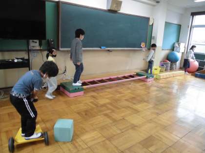 今日は朝の会でラーメン体操を踊って体を動かしました。初めて曲を聴いた子たちもノリノリで踊っていました。そのあとは,プレイルームへ行きサーキット遊びに取り組みました。順番をきちんと守りみんなで仲良く活動することができました。
