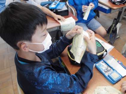 そして,針に糸を通し,玉むすびと玉どめの練習をしました。