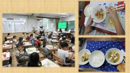 「プリプリちゅうかいためととうふとあおなのスープとごはんがおいしかったから,またたべたいなと思いました。」(2−3)