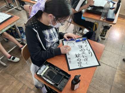 国語「秋深し」の学習で秋の俳句を考えました。今回は俳句を小筆で書き,挿絵を墨を使って描きました。社会科の学習で学んだ水墨画を思い描きながら,自分の手でオリジナリティーあふれる作品に仕上げることができました。