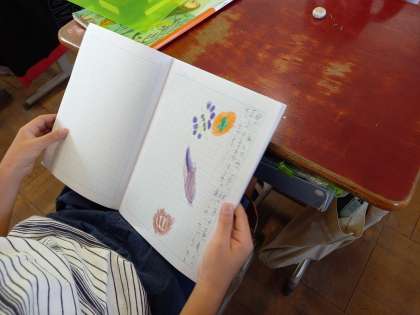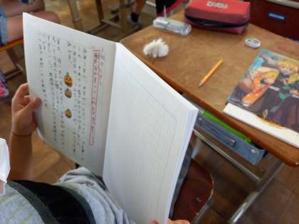 国語科「秋のくらし」の学習では,自分が見つけた「秋」について文章に表しました。虫の声が聞こえてきて心地よかったこと,サツマイモを家で食べておいしかったこと,ハロウィンの飾りつけをしたことなど,子どもたちは自分なりに文章に表していました。