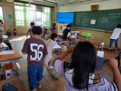 3年生の教室掃除の様子です。自分たちで協力しながら取り組んでいます。