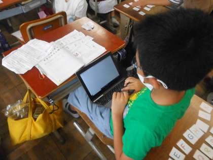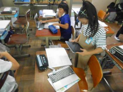 外国語活動で,「ALPHABET」の学習を行っています。今回はアルファベットの仲間分けをしました。自分で考えた仲間分けを,GIGA端末を使って写真に撮り,みんなで共有して,どんな仲間分けをしているかを考えます。